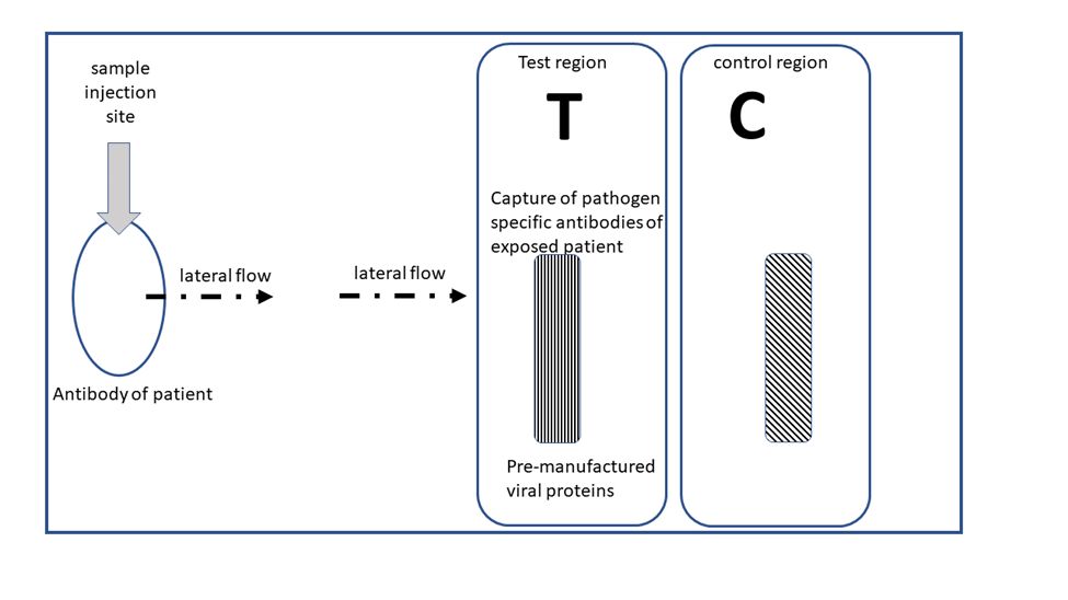 Recent advances in biotechnology have given rise to new rapid diagnostic testing methods in microbiology and human health. As a patient going to urgent care or doctor’s office you may have encountered rapid diagnostic tests for detecting the influenza virus or the virus causing COVID19. Most likely, you may use a rapid diagnostic test as an allied health professional at some time in the future. This lab module gives you some information about rapid diagnostic tests to prepare you better for your professional career. Content areas about rapid diagnostic tests include: the advantages, uses, working principles, and details of lateral flow immunochromatography. (Image: Schematic of a positive test result of a lateral flow immunochromatography test for a virus. By Illya Tietzel, 2025 Creative Commons 4.0 BY).